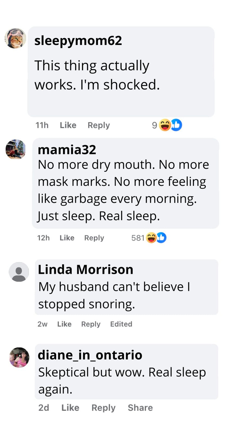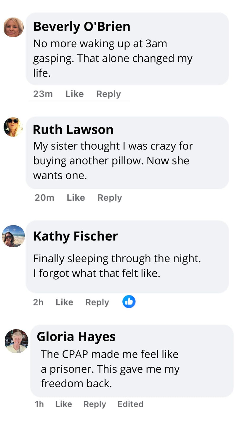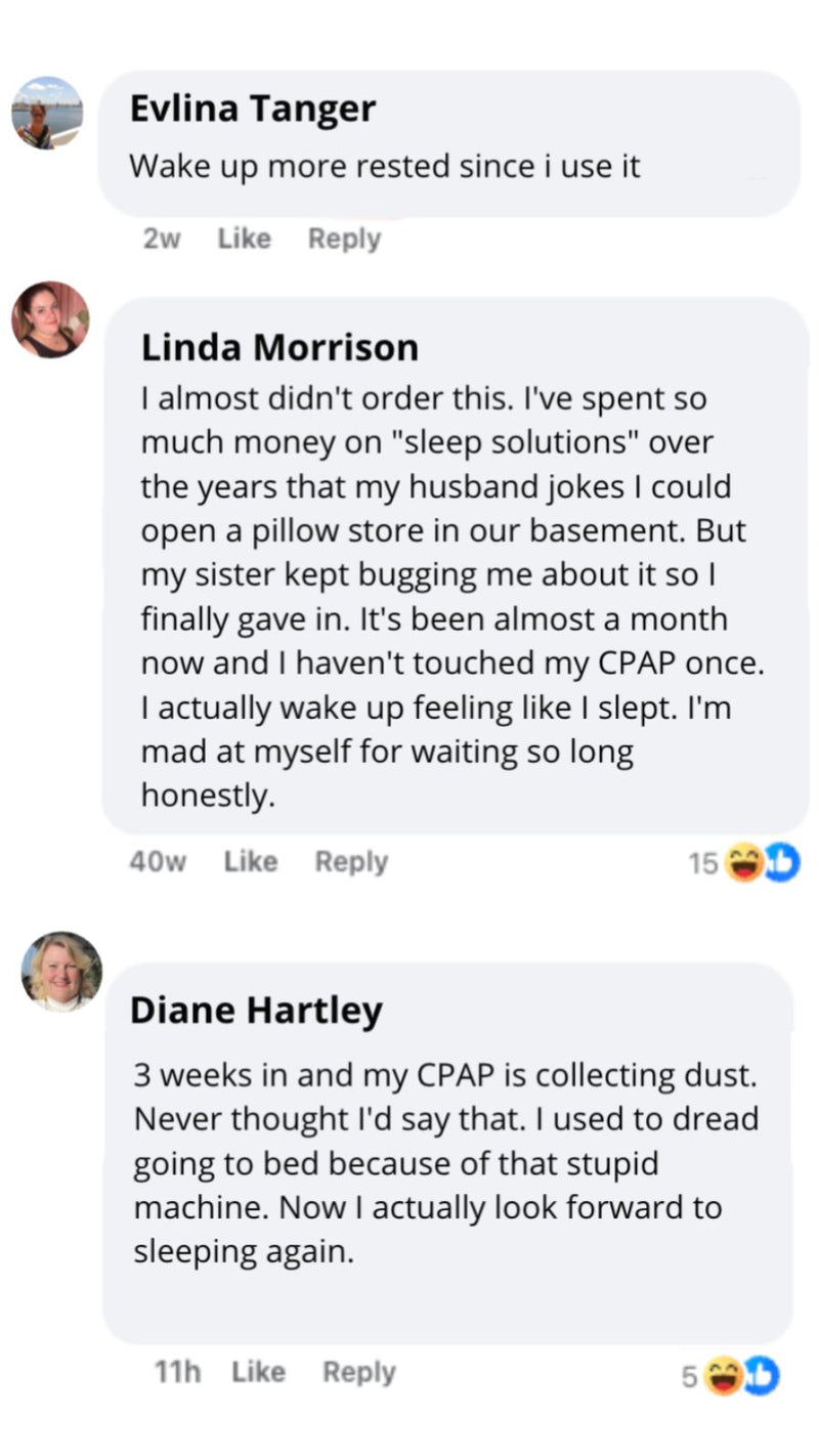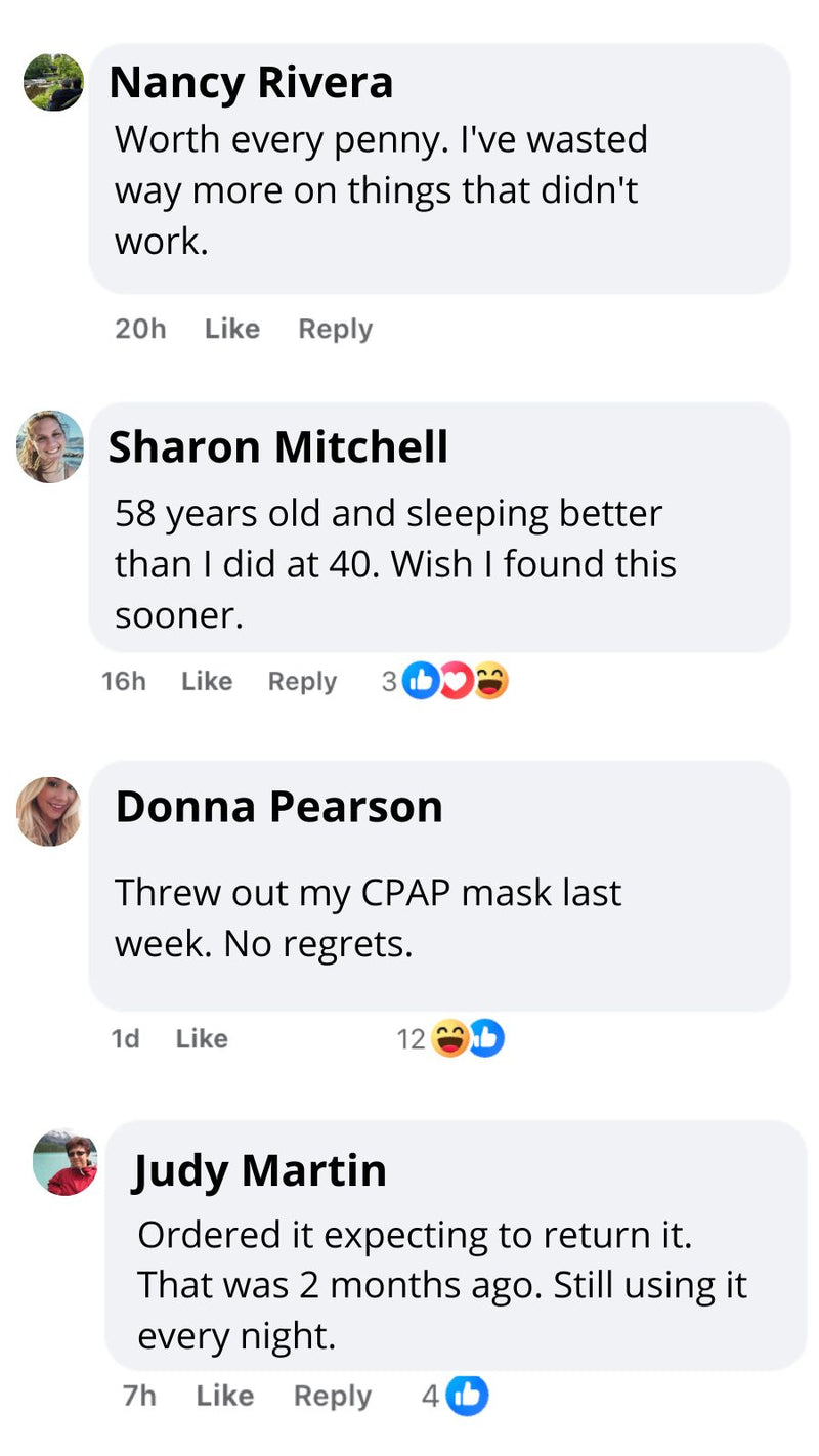 "After 4 Failed CPAPs, I'd Given Up""I accepted that tired, puffy face was just my life now. The bags under my eyes were permanent, or so I thought. My daughter convinced me to try this as a last resort. Two weeks later, I barely recognized myself in the mirror. I look 10 years younger because I'm finally sleeping."Linda S.