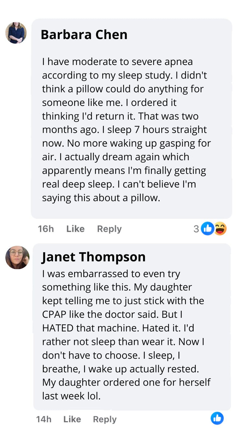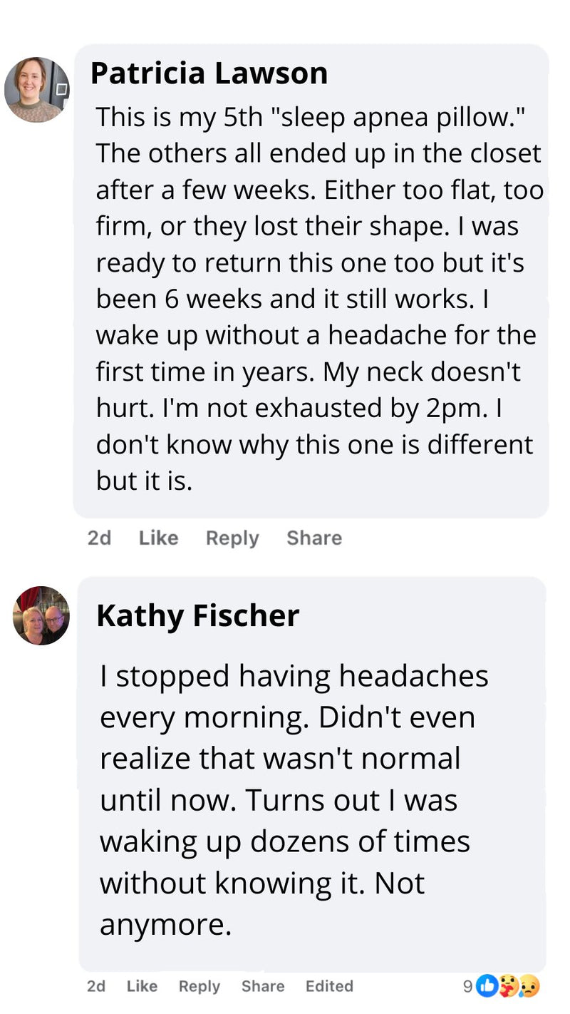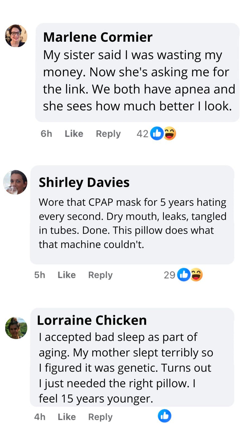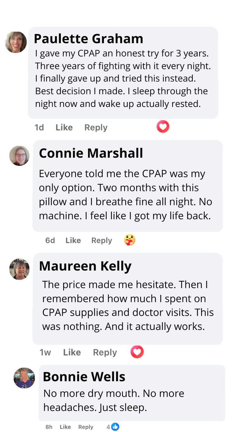 "I Didn't Think a Pillow Could Replace My CPAP""How could a pillow do what a medical machine couldn't? I almost didn't order. But I was desperate — sick of waking up with mask marks and still looking exhausted. The difference in my face says it all. No more dark circles. No more puffiness. I actually look rested because I finally AM rested."Karen T.