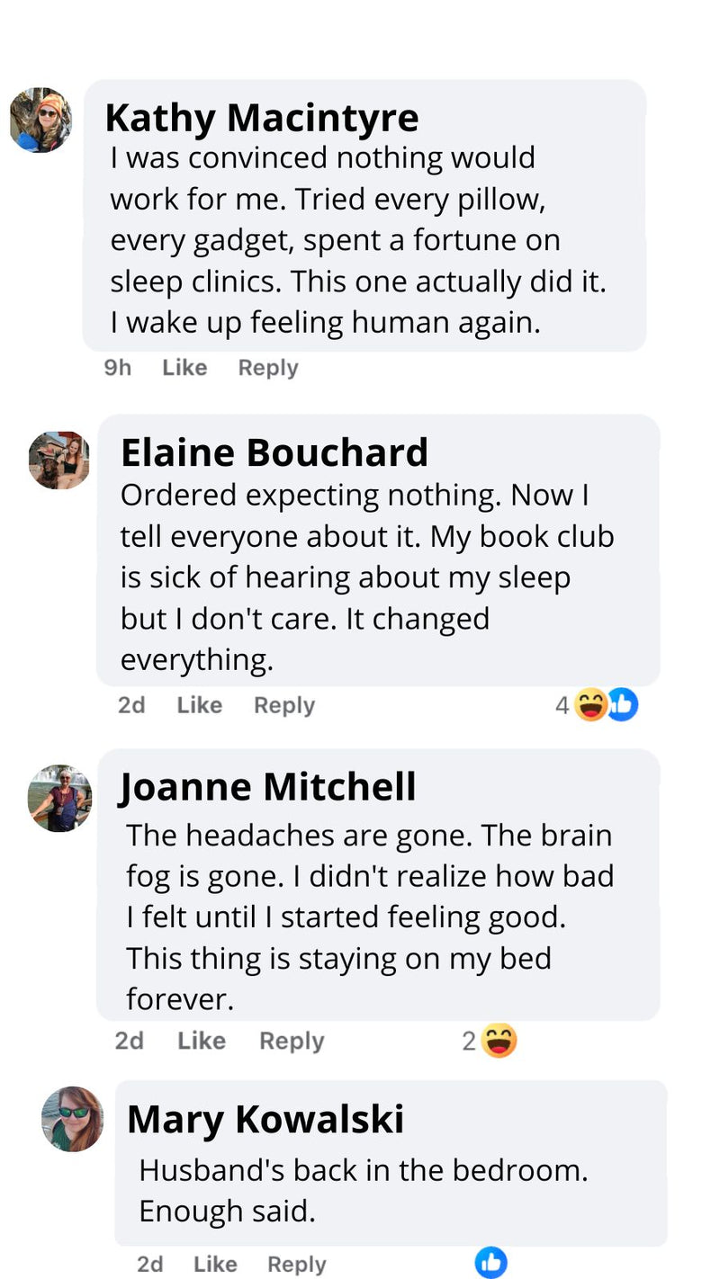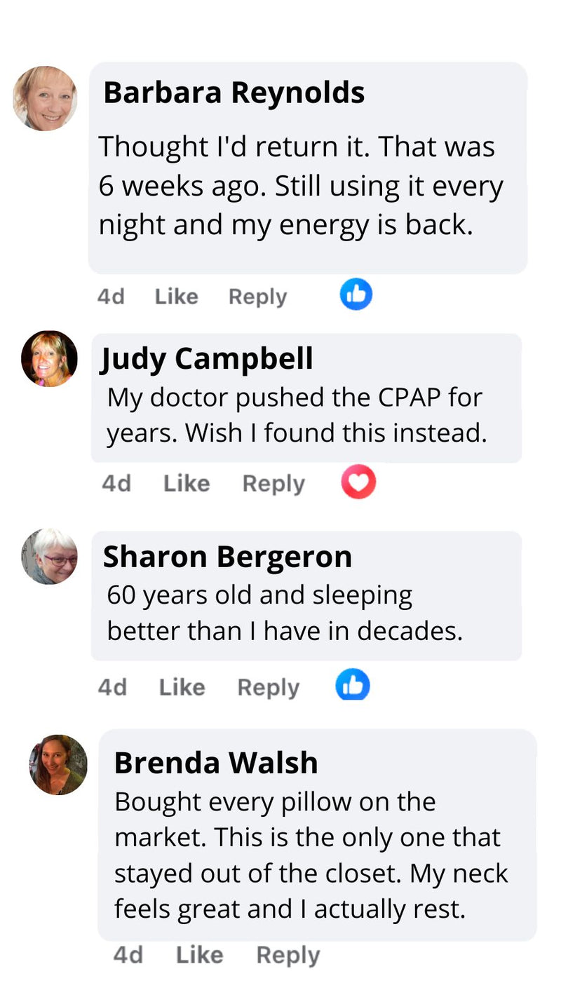 "I Thought My Case Was Too Severe" "I told myself nothing would work for me — my sleep apnea was too bad. I'd tried 2 different CPAPs and woke up every morning looking like I hadn't slept in days. Dark circles, puffy face, exhausted. Three weeks with this pillow and my husband asked what I was doing differently. Look at my eyes now. That's all the proof I need."Rebecca M.