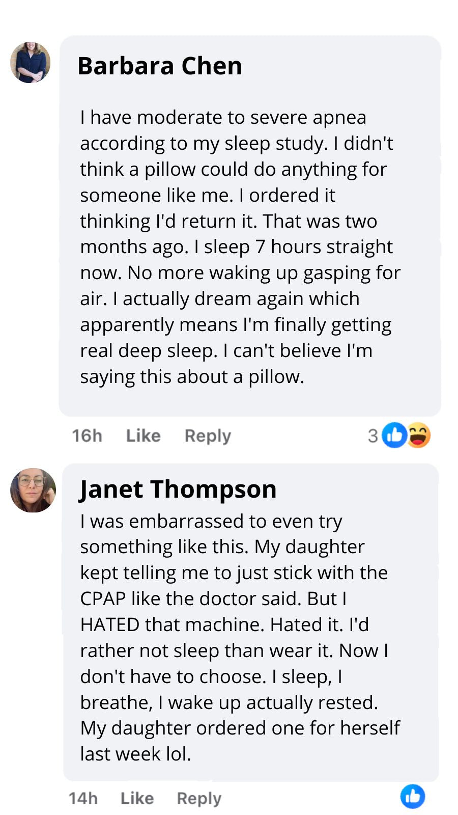 "I Thought My Case Was Too Severe" "I told myself nothing would work for me — my sleep apnea was too bad. I'd tried 2 different CPAPs and woke up every morning looking like I hadn't slept in days. Dark circles, puffy face, exhausted. Three weeks with this pillow and my husband asked what I was doing differently. Look at my eyes now. That's all the proof I need."— Rebecca M.